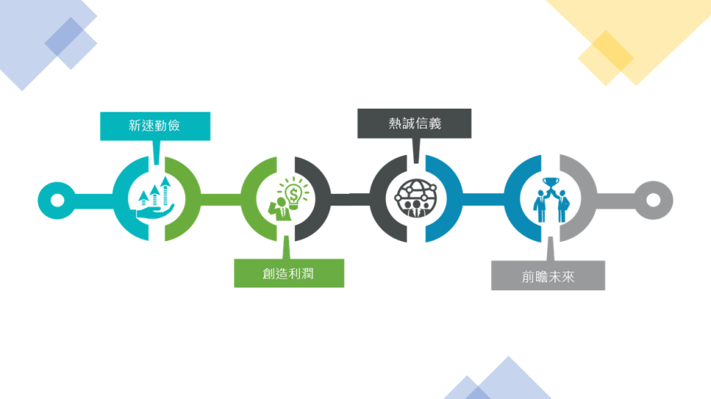 「新速勤儉、創造利潤、熱誠信義、前瞻未來」是美麗微半導體一貫秉持的經營理念,且以此理念為客戶、股東、員工及合作夥伴創造最大價值,並以勤懇的態度、務實的做法、可靠的品質作為我們營運的基石。
